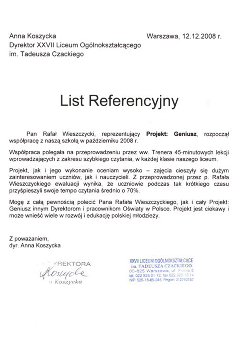 W XXVII Liceum Ogólnokształcącym im. Tadeusza Czackiego przeprowadziliśmy zajęcia dla wszystkich klas. W ciągu godziny lekcyjnej uczestnicy zwiększyli tempo czytania średnio dwukrotnie. Wielu chętnie kontynuowało dalszy rozwój umiejętności na szkoleniach.Referencje od uczestników prywatnych